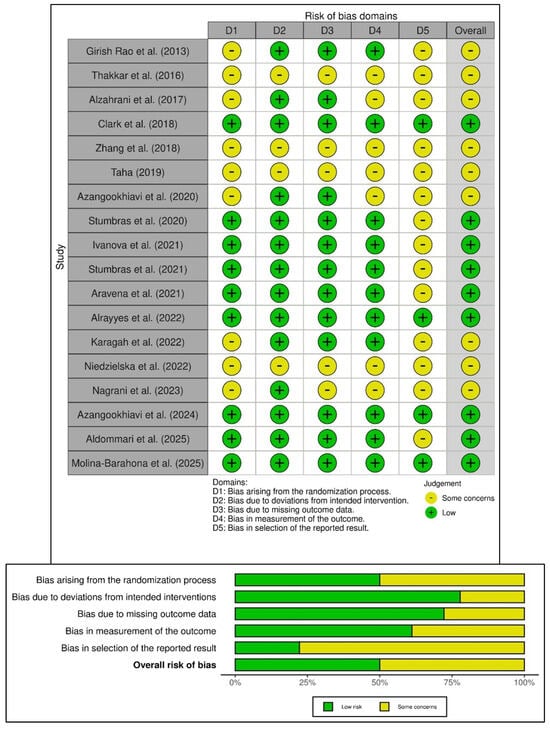 The risk of bias in the 18 included randomized controlled trials (RCTs) was assessed using the Cochrane Risk of Bias 2 (ROB-2) tool, summarized in Figure 2. Half of the RCTs showed a low risk of bias, while the remaining studies had some methodological concerns. Four RCTs (22.2%) showed low risk across all five domains [3,9,31,41], while four studies displayed concerns in all bias domains [29,32,33,38]. Specific biases included deviations from intended interventions (Domain 2—77.8%), missing outcome data (Domain 3—72.2%), and measurement bias (Domain 4—61.2%), indicating good adherence to interventions despite some follow-up issues. However, 50% of the RCTs showed bias from the randomization process (Domain 1) due to incomplete allocation concealment, and 77.8% had concerns regarding the selection of reported results (Domain 5) due to unclear blinding and selective reporting. Overall, half of the studies were low risk, but concerns in randomization and reporting warrant cautious interpretation. Notably, no studies were classified as high risk in any domain, thereby indicating moderate to high methodological quality in the evidence presented.
