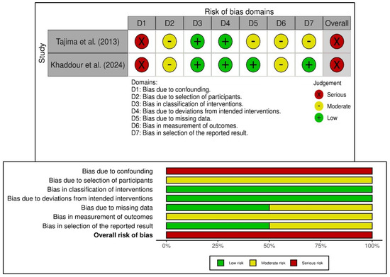 Risk of bias in the included non-randomized studies of interventions based on ROBINS-I tool showing observed bias in each study judged across the seven domains (top), and the summary of the risk-of-bias assessment (bottom) [27,40].
