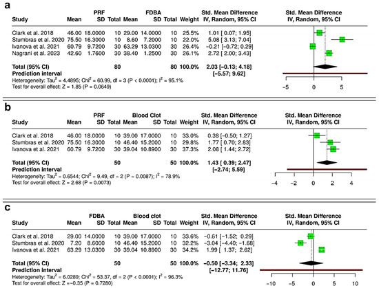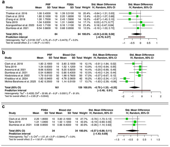 Forest plots showing the meta-analyses comparing different interventions for reduction in alveolar ridge bone width: (a) platelet-rich fibrin (PRF) versus freeze-dried bone allograft (FDBA) [10,29,31,32,33,36]; (b) PRF versus blood clot [30,31,33,36,37,38,40]; and (c) FDBA versus blood clot [31,33,36]. Data are presented as standardized mean differences (SMDs) with 95% confidence intervals (CIs) using a random-effects model. (SD—Standard deviation).