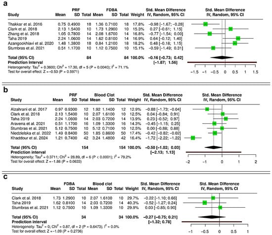 Meta-analysis of gain in histological new bone area revealed variable outcomes across comparisons. Comparing PRF versus FDBA (four RCTs; 160 extraction sockets—80 PRF, 80 FDBA), the pooled analysis indicated a trend favoring PRF, with a standardized mean difference (SMD) of 2.03 (95% CI: −0.13 to 4.18; p = 0.065), but without statistical significance (Figure 6a). Heterogeneity was very high (I2 = 95.1%), and the prediction interval (−5.57 to 9.62) showed wide variability, suggesting that future studies could report outcomes in either direction. To compare both PRF and FDBA versus blood clot, three RCTs with 100 extraction sockets (50 PRF, 50 FDBA, and 50 blood clot) were analyzed. Between PRF and blood clot, the pooled effect showed a statistically significant benefit with PRF (SMD = 1.43; 95% CI: 0.39 to 2.47; p = 0.007) (Figure 6b). Heterogeneity was substantial (I2 = 78.9%), and prediction interval (−2.74 to 5.59) suggested that variability in effect sizes remains likely. Evaluating FDBA versus blood clot (Figure 6c), there was no significant difference between the interventions (SMD = −0.50; 95% CI: −3.34 to 2.33; p = 0.728), with extremely high heterogeneity (I2 = 96.3%), and the prediction interval (−12.77 to 11.76) reflected major inconsistency across studies. Overall, PRF showed a significant advantage over spontaneous healing with blood clot in enhancing histomorphometric bone area. Although PRF had a favorable trend compared to FDBA, it was not statistically significant due to high heterogeneity, while FDBA did not show a consistent benefit over blood clot.