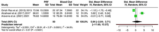 Forest plot showing the meta-analysis comparing platelet-rich fibrin (PRF) and blood clot for gain in radiographic bone fill (%) [28,30,37]. Data are presented as standardized mean differences (SMDs) with 95% confidence intervals (CIs) using a random-effects model. (SD—Standard deviation).