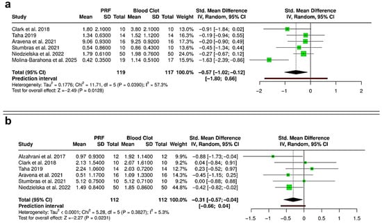 Forest plots showing the sensitivity analyses comparing platelet-rich fibrin (PRF) and blood clot for alveolar ridge preservation outcomes: (a) reduction in ridge height [31,33,36,37,38,41]; and (b) reduction in ridge width [30,31,33,36,37,38]. Analyses were performed using a random-effects model and presented as standardized mean differences (SMDs) with 95% confidence intervals (CIs), to compare results without inclusion of the non-randomized study by Khaddour et al. (2024) [40]. (SD—Standard deviation).