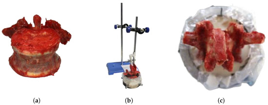 Specimen preparation. (a) Separated dissected lumbar vertebra. (b) Vertebra in sleeve, held by embedding device. (c) Vertebra embedded in rapid casting resin.