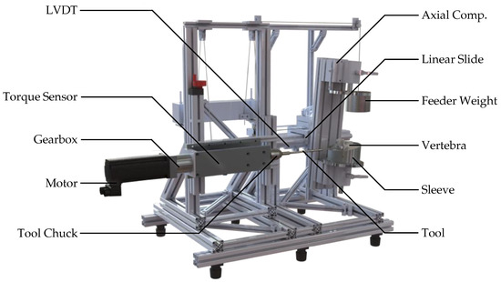 A dedicated test rig was developed to enable reproducible biomechanical evaluation of pedicle screw insertion, as shown in Figure 2. The specimen embedding sleeve was securely mounted on a unit for multi-axis rotational compensation, which is coupled to a precision linear slide to ensure reproducible colinear alignment of the insertion axis of all tools with the pre-planned trajectory. To guide the linear slide, a deflected feeder weight was utilized, which applied 27.6 N directly in the slide’s traversing axis.