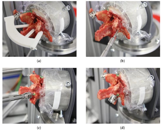 All three procedural steps—drilling, tapping, and screw insertion—were performed at a constant speed of 25 min−1, using original instrumentation (Medacta International, Castel San Pietro, CH-TI). The entire insertion process is illustrated exemplarily in Figure 3 on a right pedicle screw. After completion of the left pedicle insertion, the vertebra was repositioned within the test rig to align the right pedicle. The drill-guide template was trimmed around the support shaft of the inserted left screw and the procedure was repeated under identical conditions.