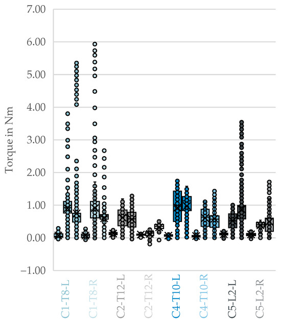Regional analysis: The stratification of data into thoracic (T8–T12) and lumbar (L1–L5) spinal segments revealed no statistically significant differences in peak torque between correct and misaligned trajectories within individual phases.