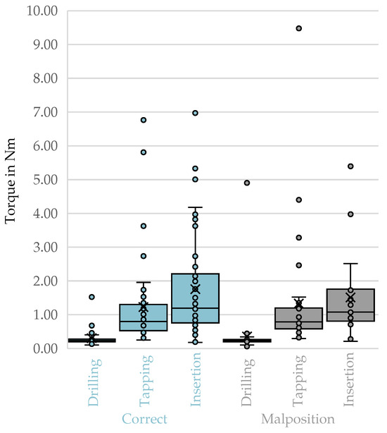 Top-3-avg of the phases of drilling, tapping, and screw insertion for correct trajectories compared to malpositions. X: mean value of the dataset, circles: outliers located more than 1.5 times the interquartile range.