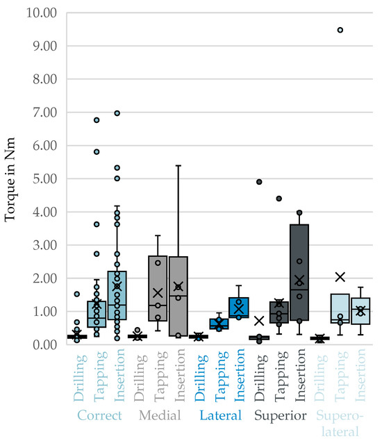 A statistically significant difference in peak torque was observed between the correct trajectory and the superolateral malposition () during the drilling phase. This indicates reduced torque performance in the presence of this deviation. However, all other comparisons within this phase—medial (), lateral () and superior ()—showed no statistically significant differences (). In the tapping phase, none of the comparisons between the correct trajectory and the malpositioned trajectories yielded statistically significant differences in peak torque values (all ). Similarly, in the screw insertion phase, no significant differences were found between correct placement and any of the tested malpositions (all ). The detailed results can be found in Table 9 below.