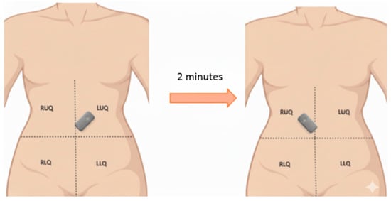 We collected 110 high-quality PEG recordings from eight healthy volunteers (5 male, 3 female; age range: 22–35 years) in a controlled, acoustically shielded environment after Mayo Clinic IRB approval. The recordings were obtained using an Eko DUO® digital stethoscope placed at the left upper quadrant (LUQ) and right lower quadrant (RLQ) in a controlled low-noise environment. The subjects underwent both fasting and postprandial recordings to capture physiological variability in bowel motility [11]. No participants had a history of gastrointestinal disorders. Microelectromechanical (MEMS) microphones were affixed to the lower-right abdominal quadrant using skin-safe adhesive to ensure contact and reduce motion artifacts shown in Figure 1. Each recording was 2 min long, sampled at 44.1 kHz with 16-bit resolution. Audio data were normalized for amplitude and pre-screened to remove segments with clipping or excessive ambient noise. No filtering, such as bandpass or denoising, was applied to preserve raw acoustic features.