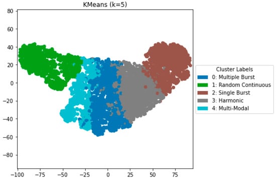 We evaluated three clustering algorithms—K-Means (k = 5), agglomerative clustering, and spectral clustering—employing UMAP-reduced features. K-Means exhibited the best-balanced performance across all clustering metrics, producing five distinct clusters that correspond to standard bowel sound categories: single-burst, multiple-burst, harmonic, random-continuous, and multi-modal. The clusters were confirmed through visual inspection of waveform morphologies and spectral properties.