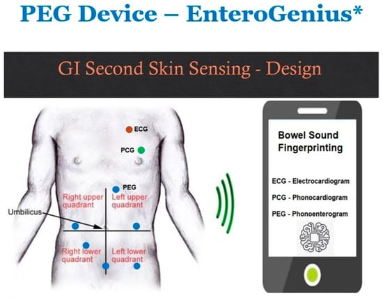 ECG time stamps and PCG templates will allow automatic denoising to extract clean PEG signals for bowel sounds fingerprinting to characterize various bowel diseases. Six-time synchronized PEG sensors will capture long term bowel sounds corresponding to the peristatic movements of the bowel, to provide novel insights on bowel motility and its associated physiology based on the prominent bowel sound detection and analytics of the five different PBS reported. The noninvasive setup of EnteroGenius* configuration can also be used in tandem with colonoscopy, manometry, intestinal ultrasound, etc., that allows novel insights into digital PEG features that correlates to major findings from these invasive techniques used for detecting and diagnosing various bowel diseases.