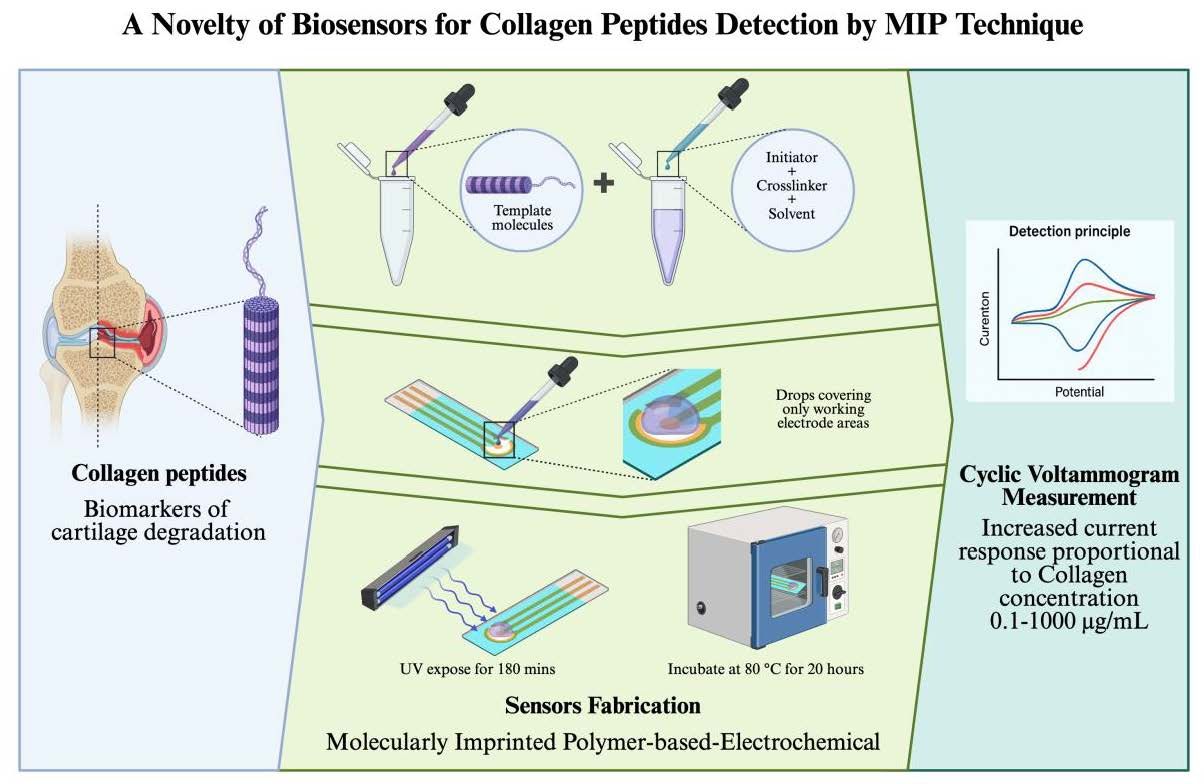 - Binding Analysis: Upon introduction of collagen peptides, changes in the current response indicated successful molecular recognition by the MIPs.