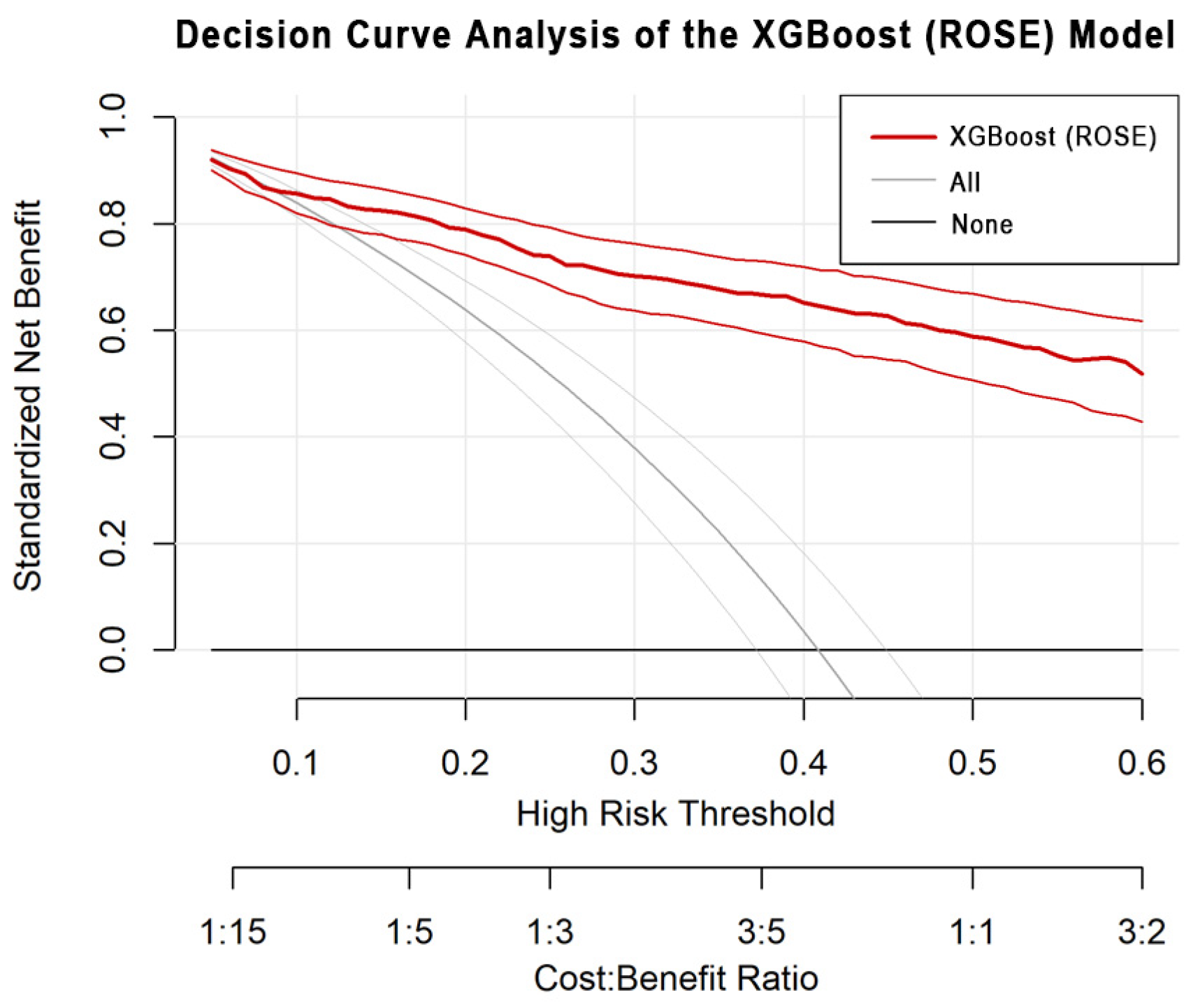 - Cost-sensitive learning using the scale_pos_weight parameter, which adjusts the loss function to penalize misclassification of minority (positive) cases. The parameter was set to 2.8, reflecting the negative-to-positive HRI sample ratio (2762:990) in the training dataset.