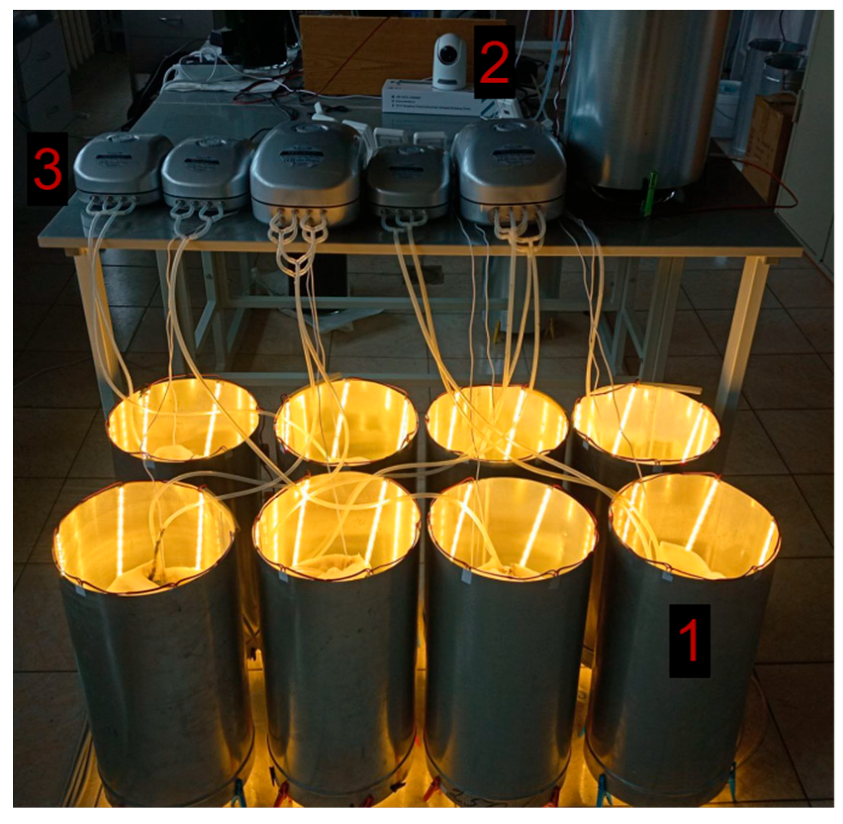 Chlorella vulgaris was studied in a laboratory plant consisting of eight identical photobioreactors (PBRs). Each PBR was a glass cylindrical vessel with a total volume of 6 L (40 cm height, 14 cm diameter). The working culture volume was 4 L. Illumination was provided by external metal housings equipped with LED strips. The average light intensity at the center of an empty vessel was 18 klx (250 μmol photons m
