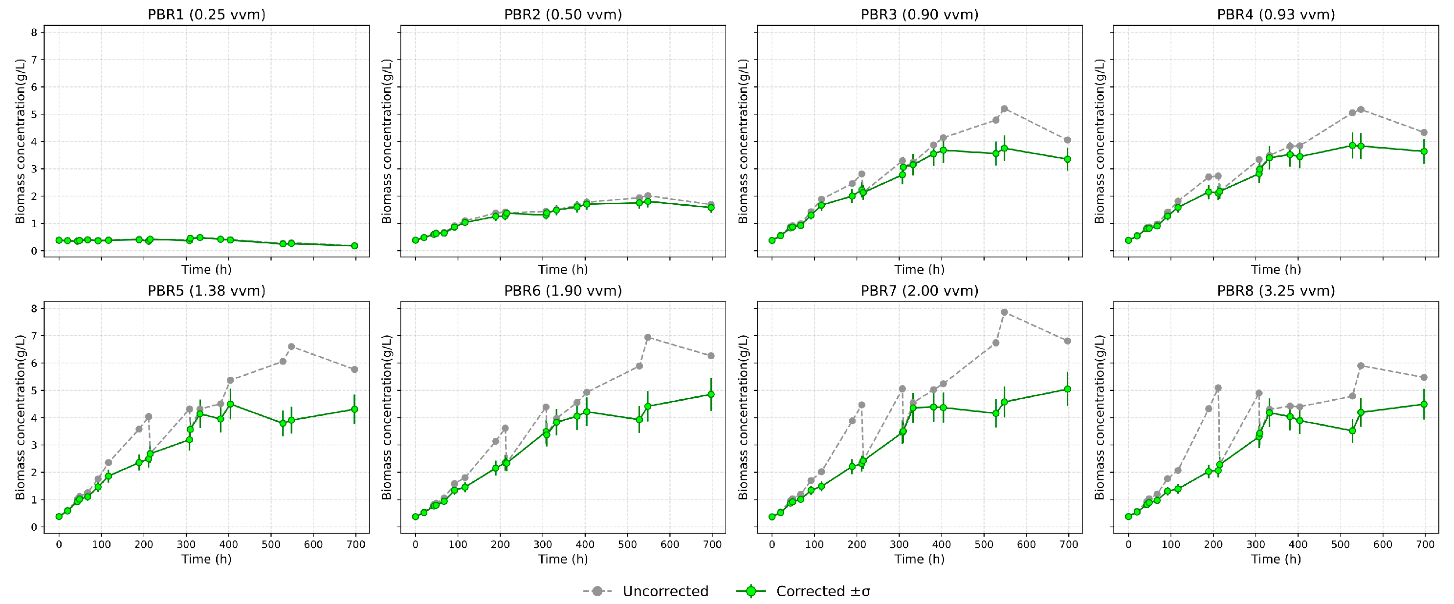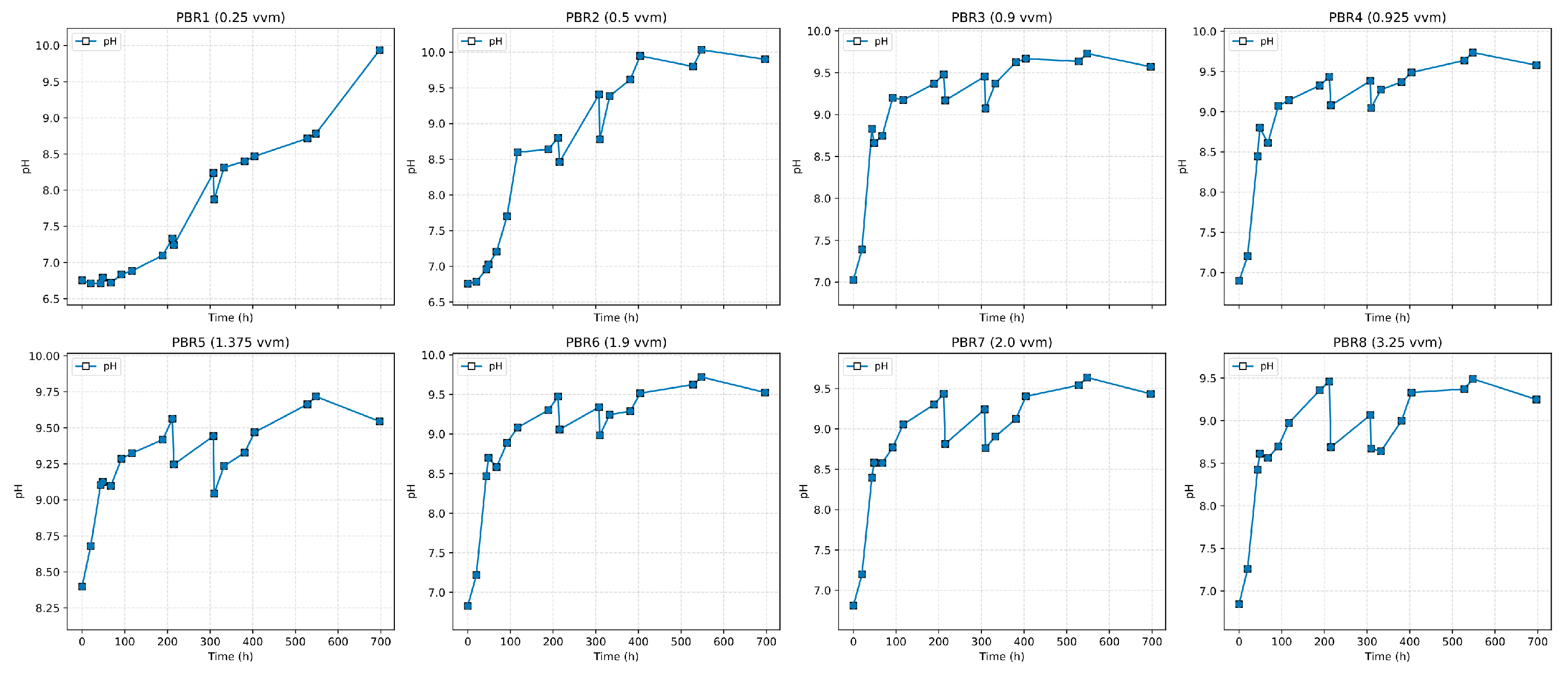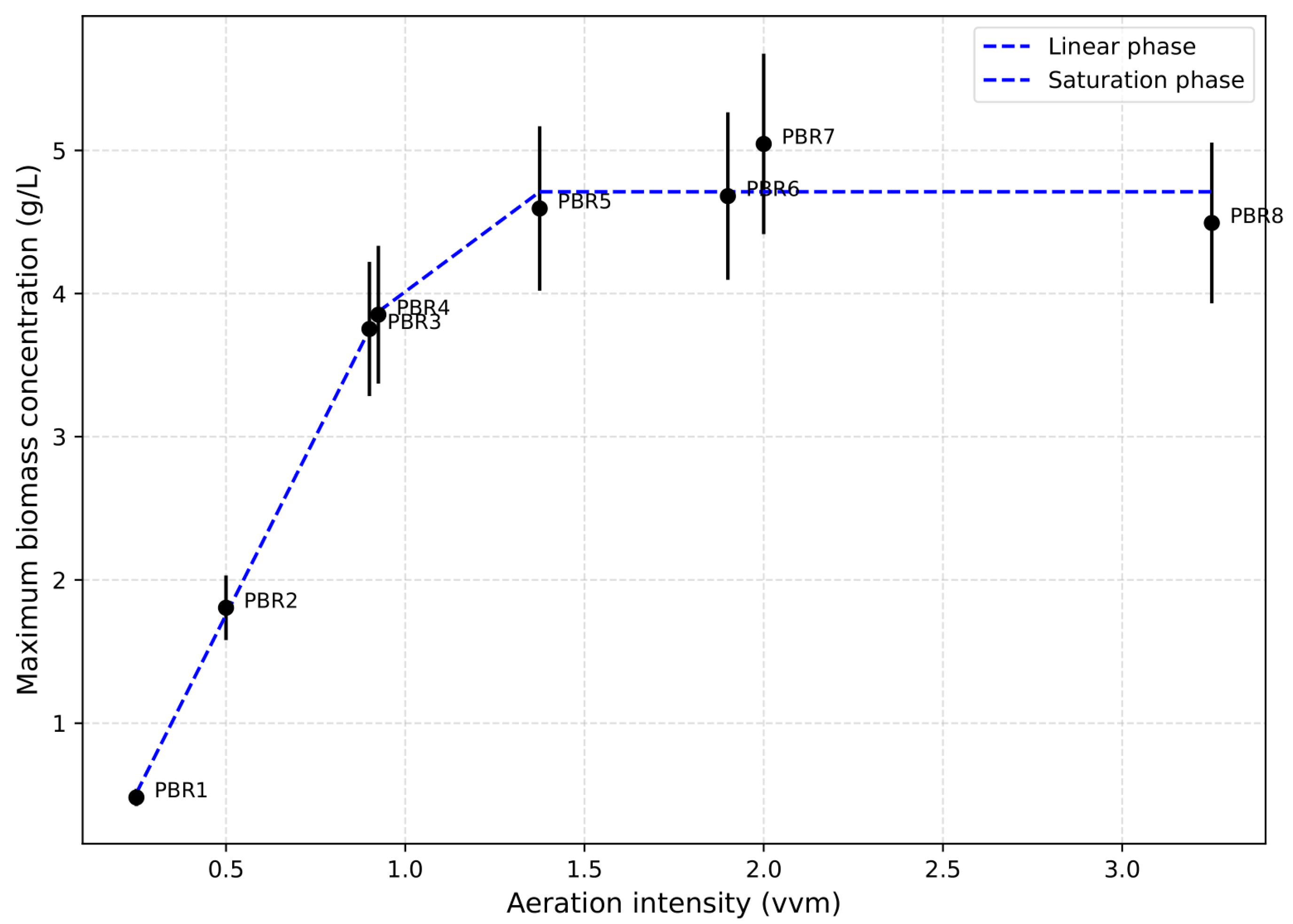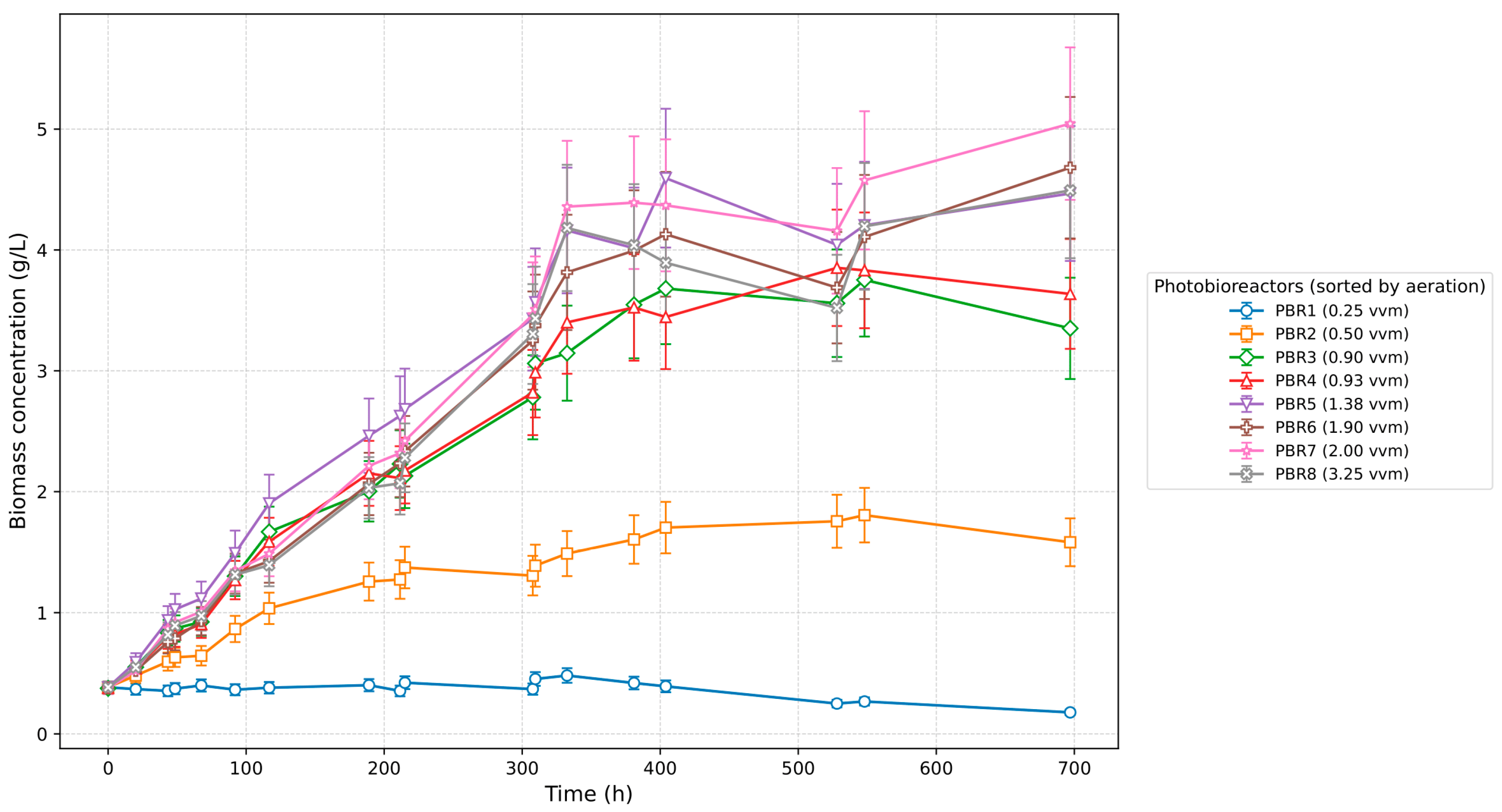 16]. It should be emphasized that aeration thresholds vary with reactor configuration and scale. The present results primarily apply to the 4 L bubble-column PBR used in this study.