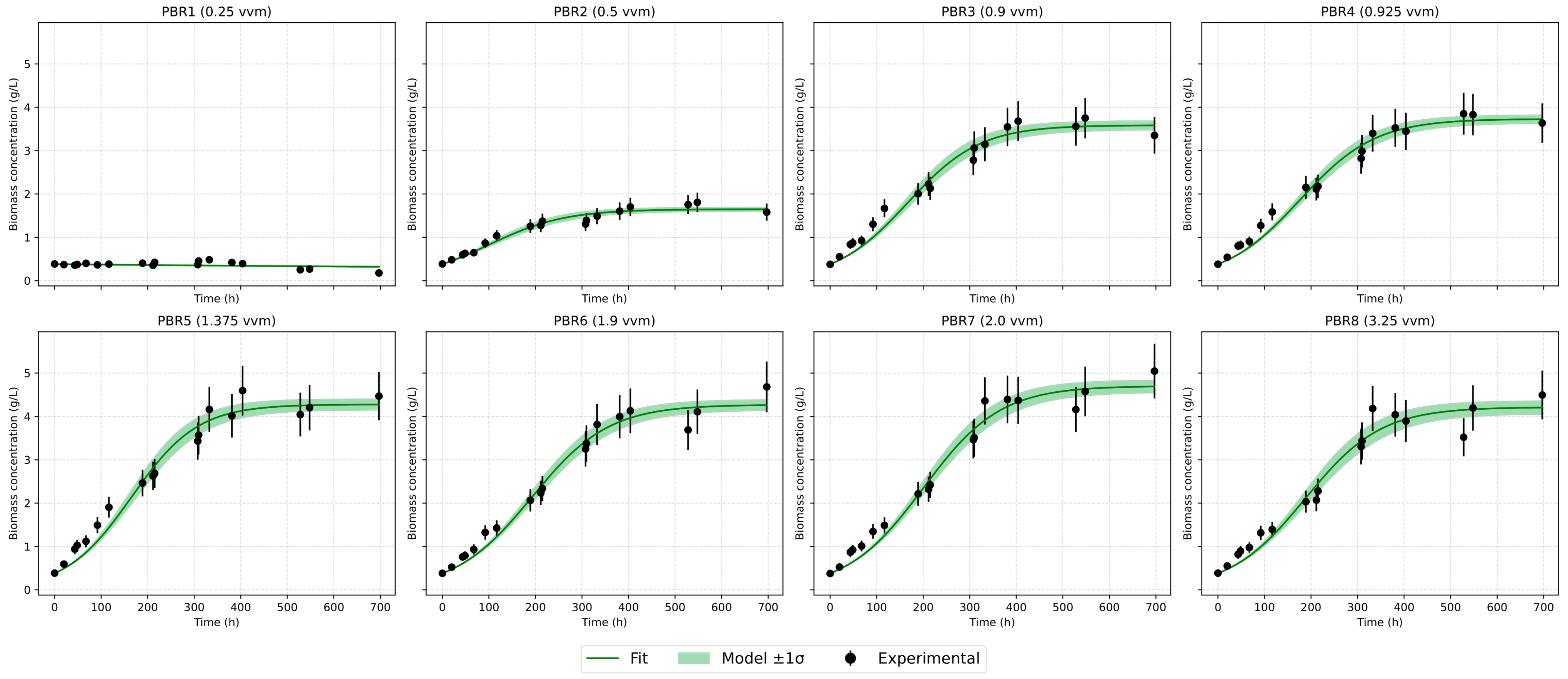 2 enhanced biomass productivity by 14.3%, while a further increase to 11 L/min caused cell wall damage. These results confirm the tendency observed in our study: aeration can only be optimized within a restricted range, and the threshold values strongly depend on reactor design and scale. The literature emphasizes that optimal vvm values vary with PBR configuration and size, consistent with our findings for a 4 L reactor.