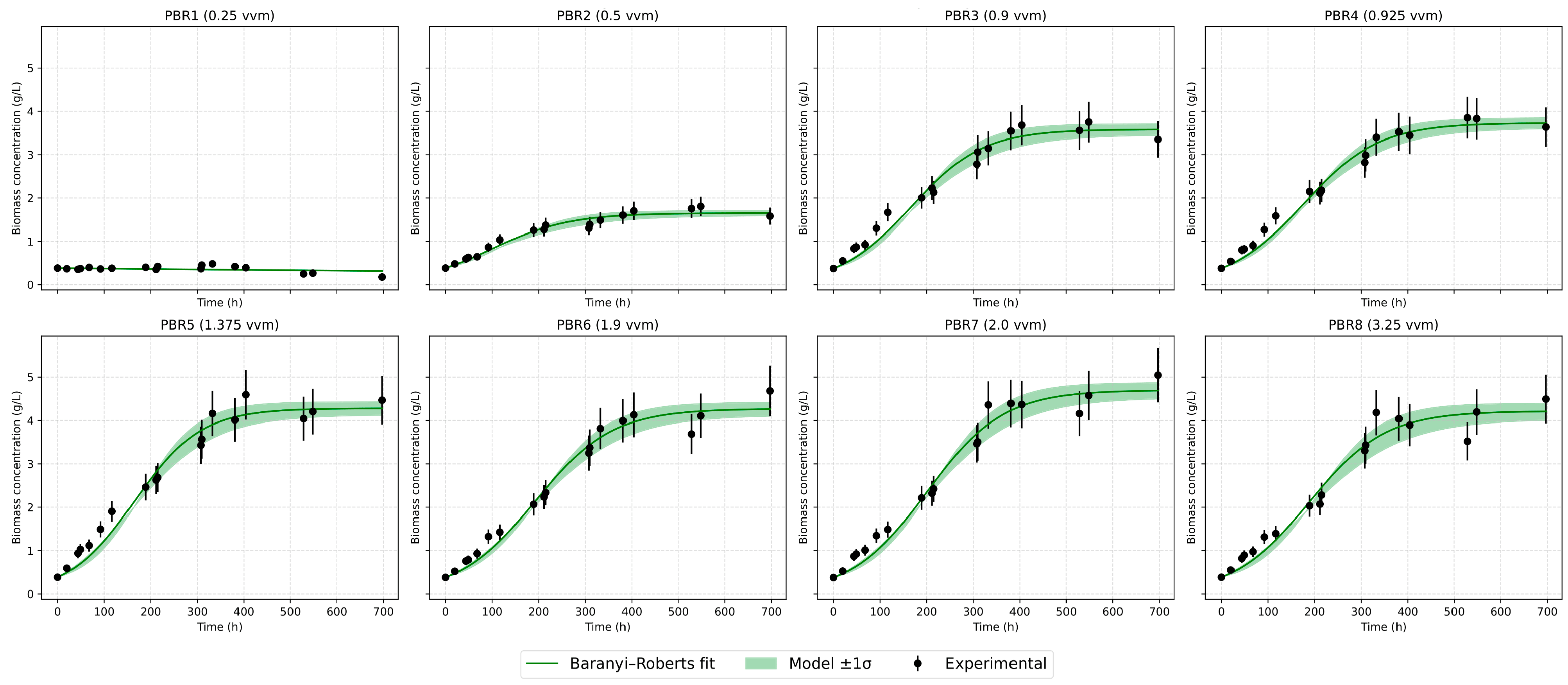 The Baranyi–Roberts model extends the Gompertz and logistic equations by explicitly modeling the physiological adaptation process through the function A(t), which describes the gradual activation of metabolic potential after inoculation. This makes the model particularly suitable for describing algal growth under stress conditions, such as changes in aeration or illumination intensity.