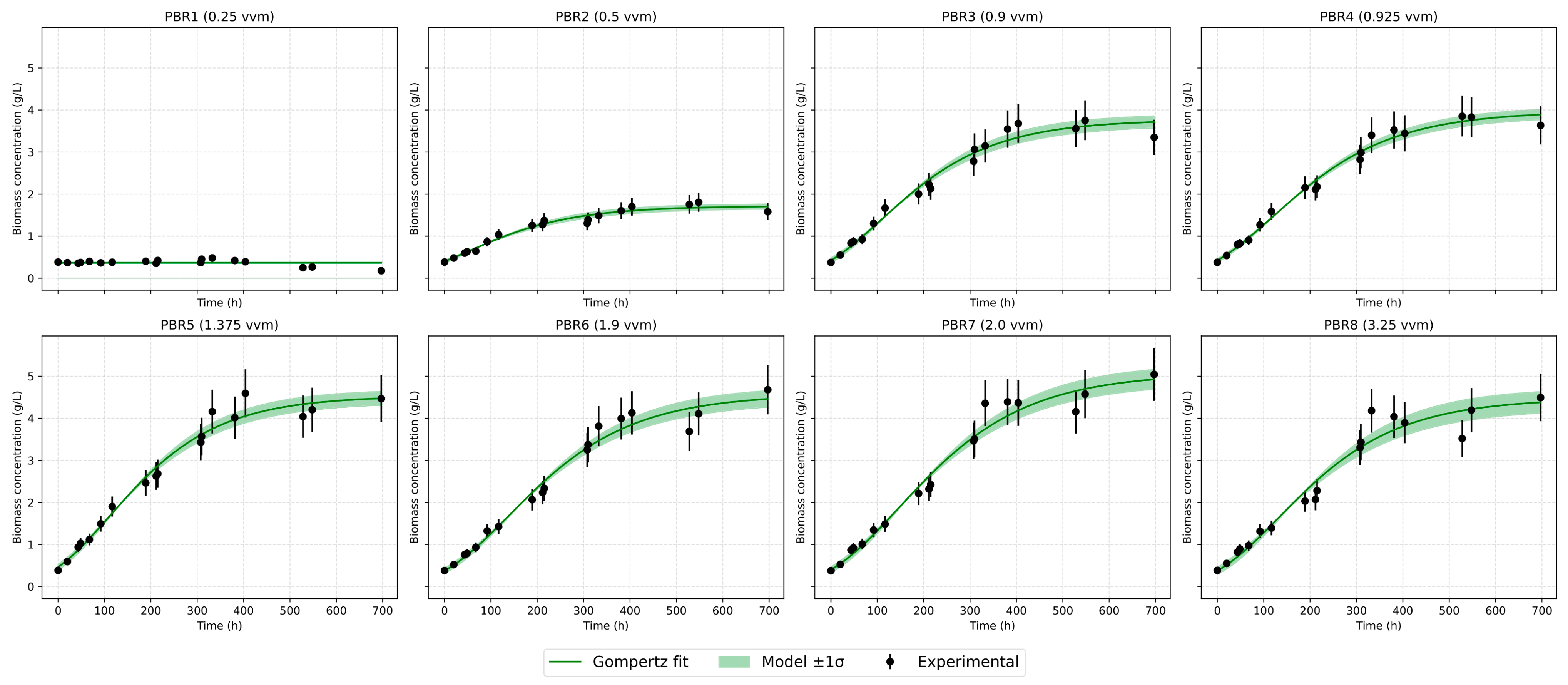 The Gompertz model has been widely applied to describe microbial and algal growth processes, especially when the growth rate gradually decreases as biomass accumulates [