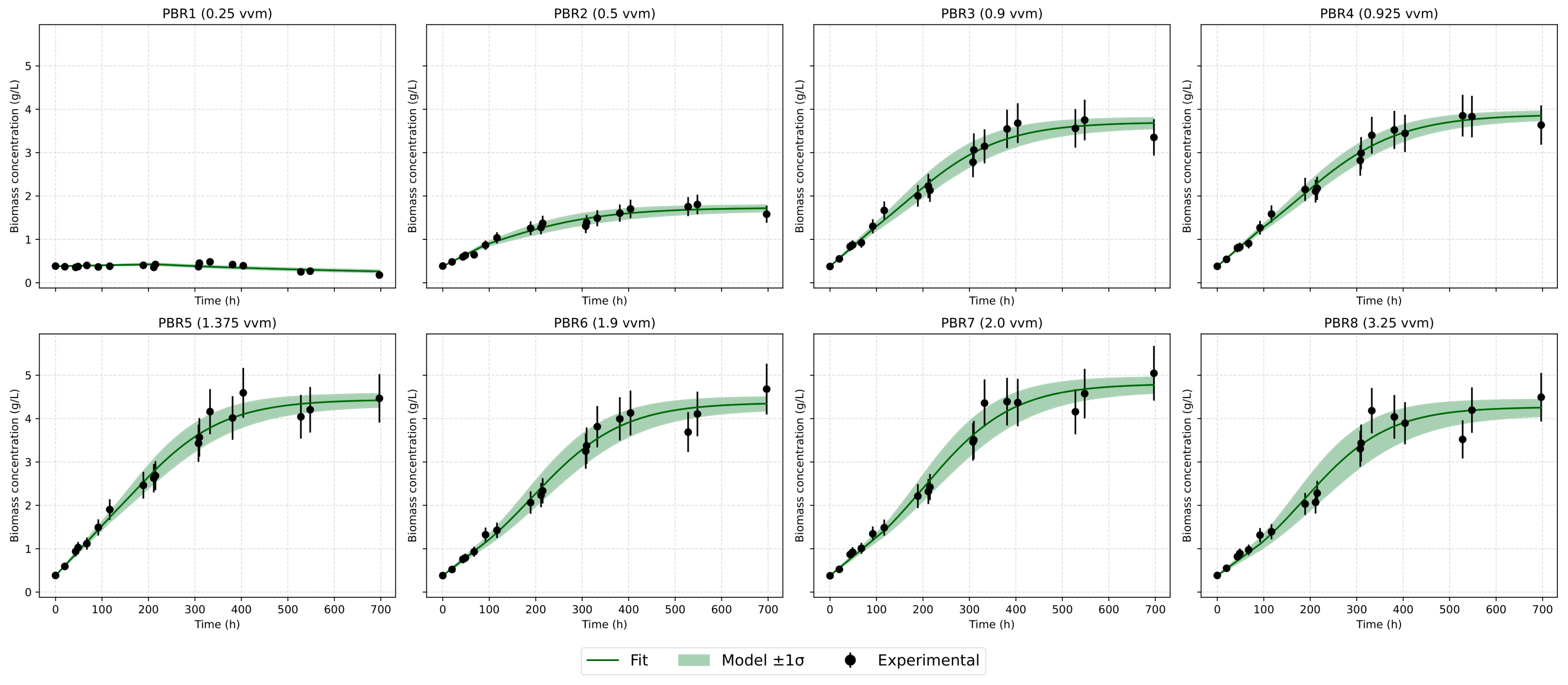 In addition, the Monod × Gauss model was developed to integrate the effects of aeration and temperature. The fitted parameters (μmax ≈ 0.0136 g/L·h, KB ≈ 0.5 vvm, Topt ≈ 26 °C) were consistent with literature values. This model enables quantitative linkage of aeration and temperature effects, enhancing the predictive capacity of growth dynamics for potential photobioreactor scale-up.