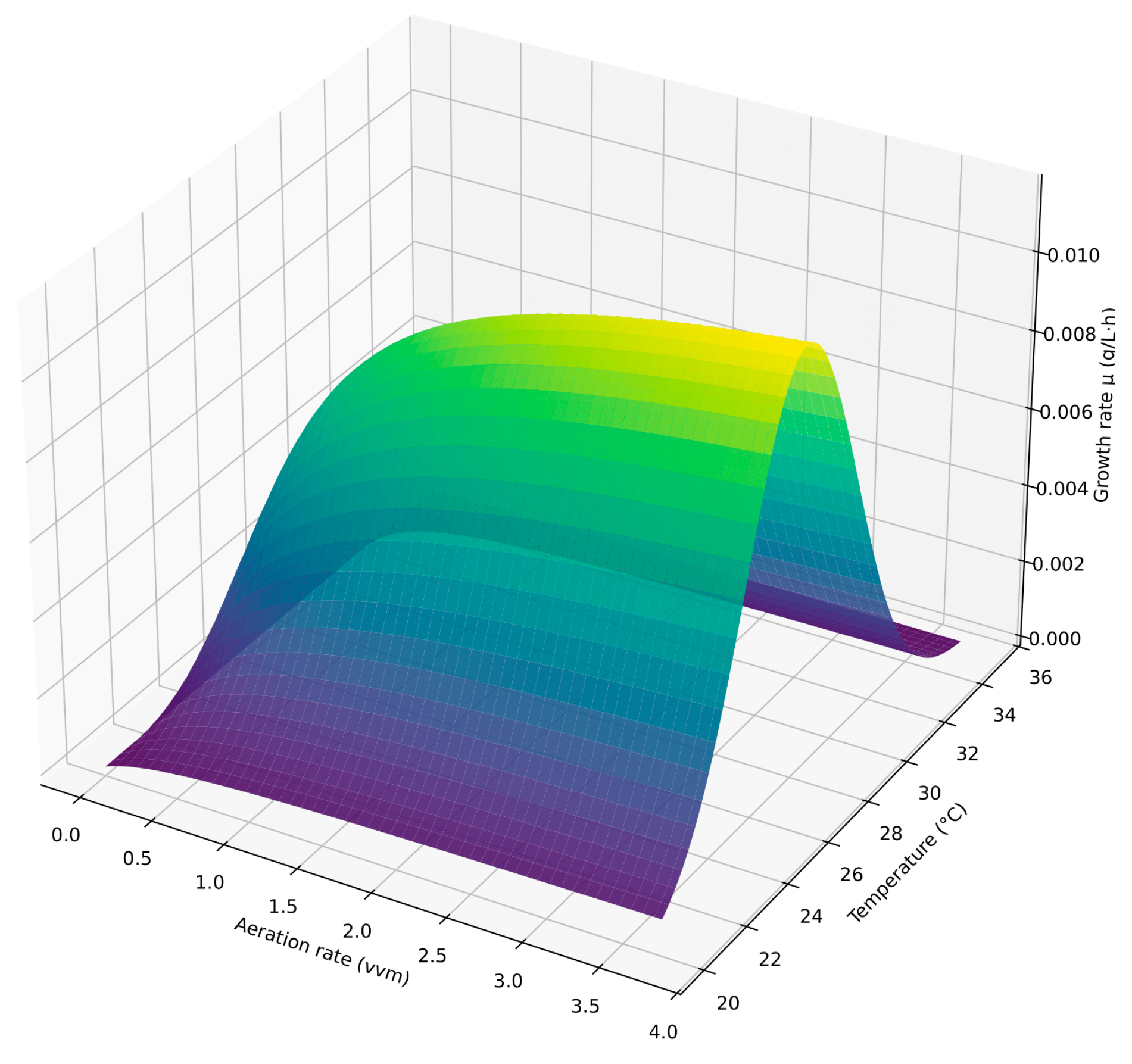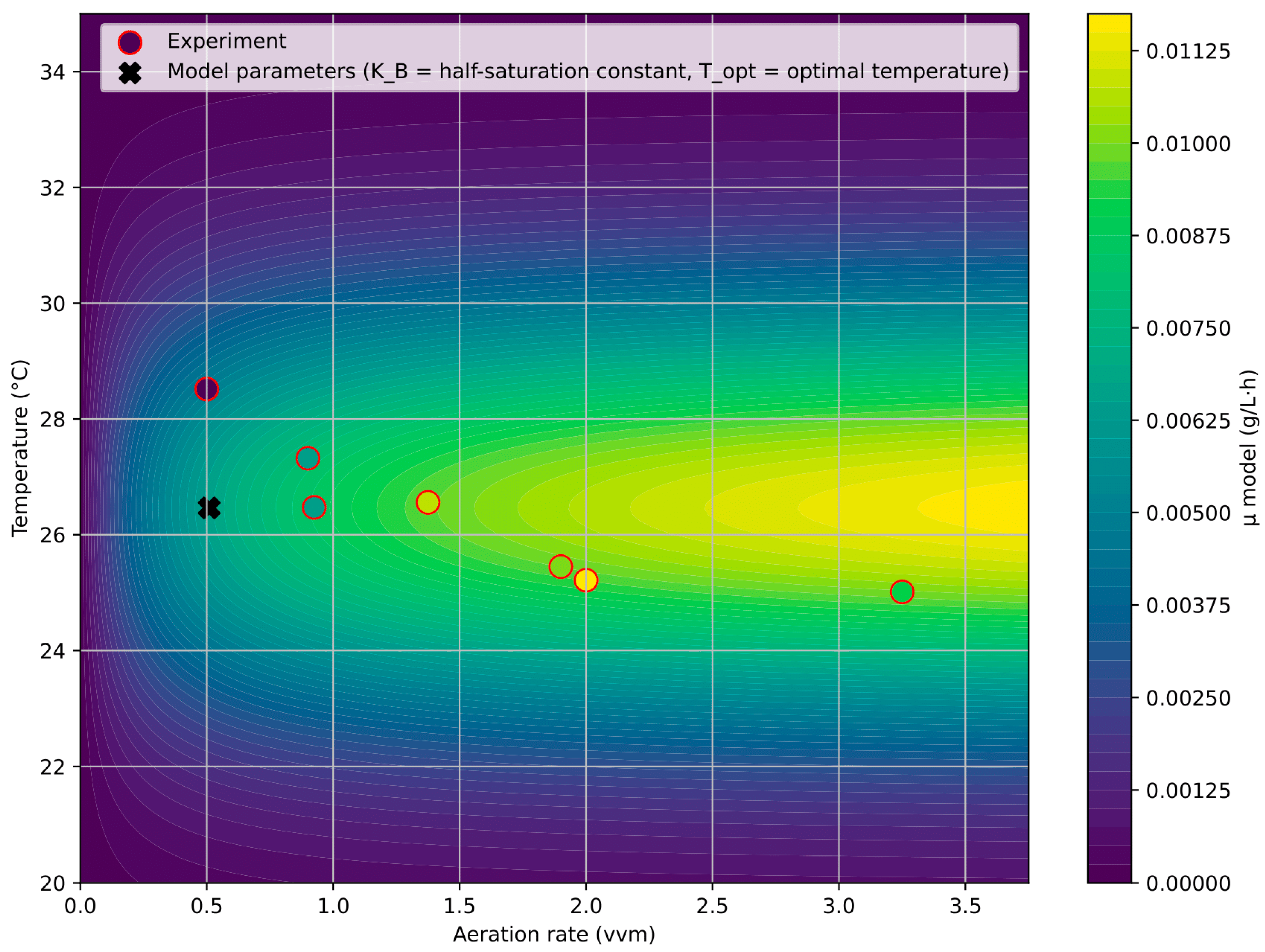 This model considers two key factors. The effect of sparging is described by a Monod function, reflecting saturation of gas exchange and mixing at higher air flow rates. The dependence on temperature is approximated by a Gaussian function, since growth rate is maximal near the optimum and decreases with deviations in either direction. The model assumes independence of temperature and sparging effects, without accounting for potential cross-interactions. Other limiting factors (light, pH, nutrients) are not considered.