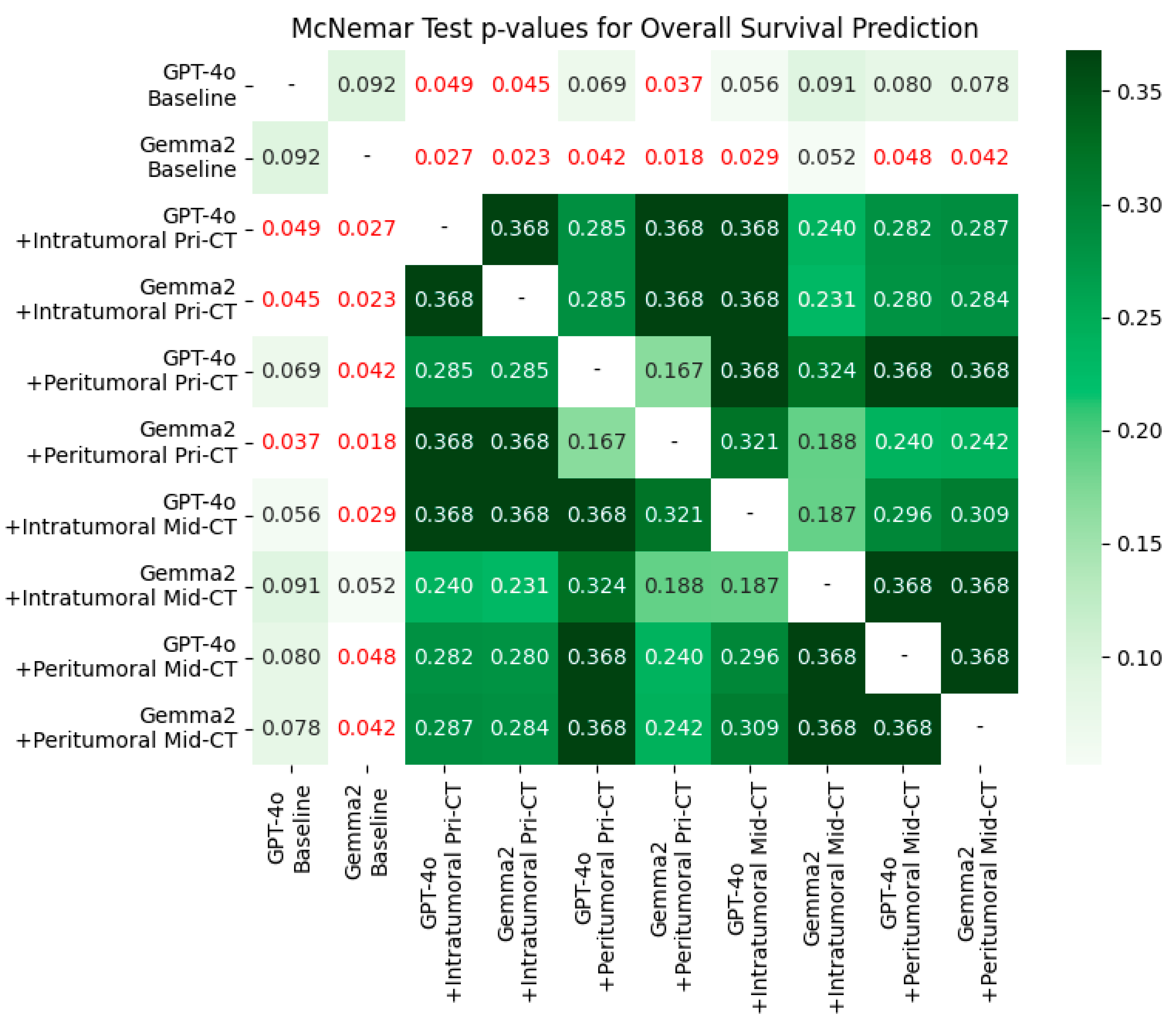 - Sun, D.; Yu, R.; Zhao, S.; Zheng, W.; Wang, Z.; Zhao, Z. Outcome Prediction Using Multi-Modal Information: Integrating Large Language Model-Extracted Clinical Information and Image Analysis. Cancers 2024, 16, 2402. [Google Scholar] [CrossRef]