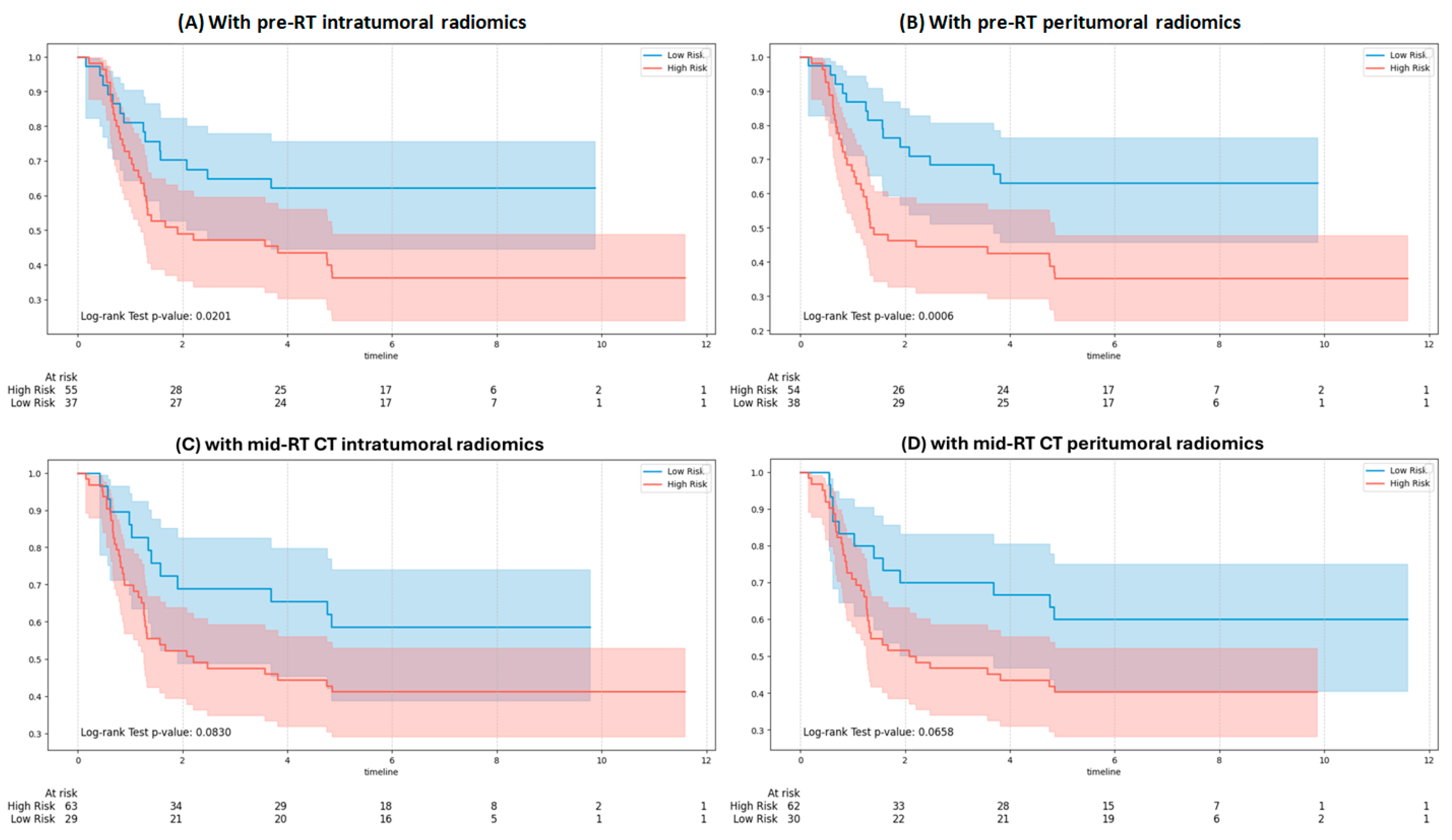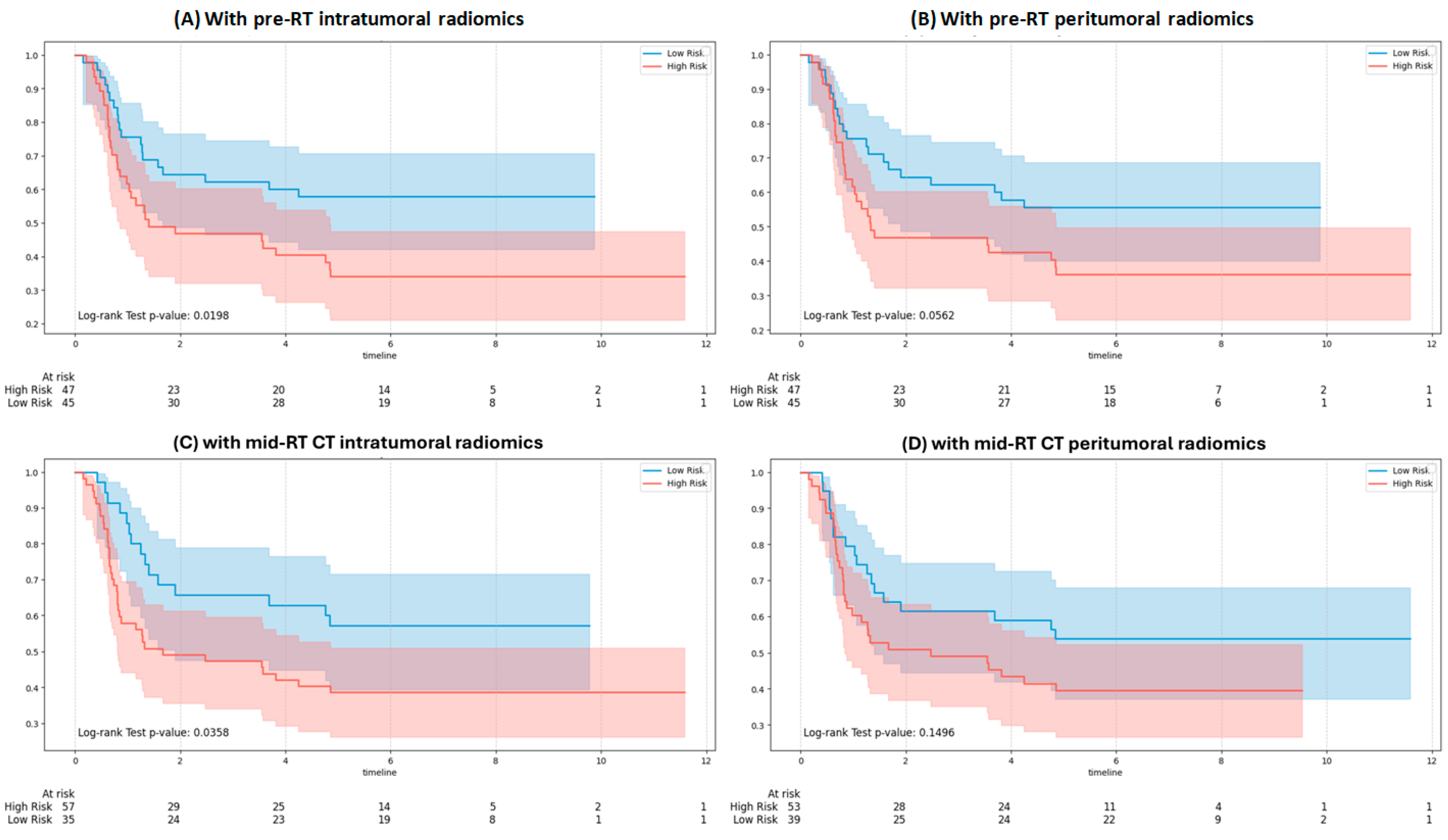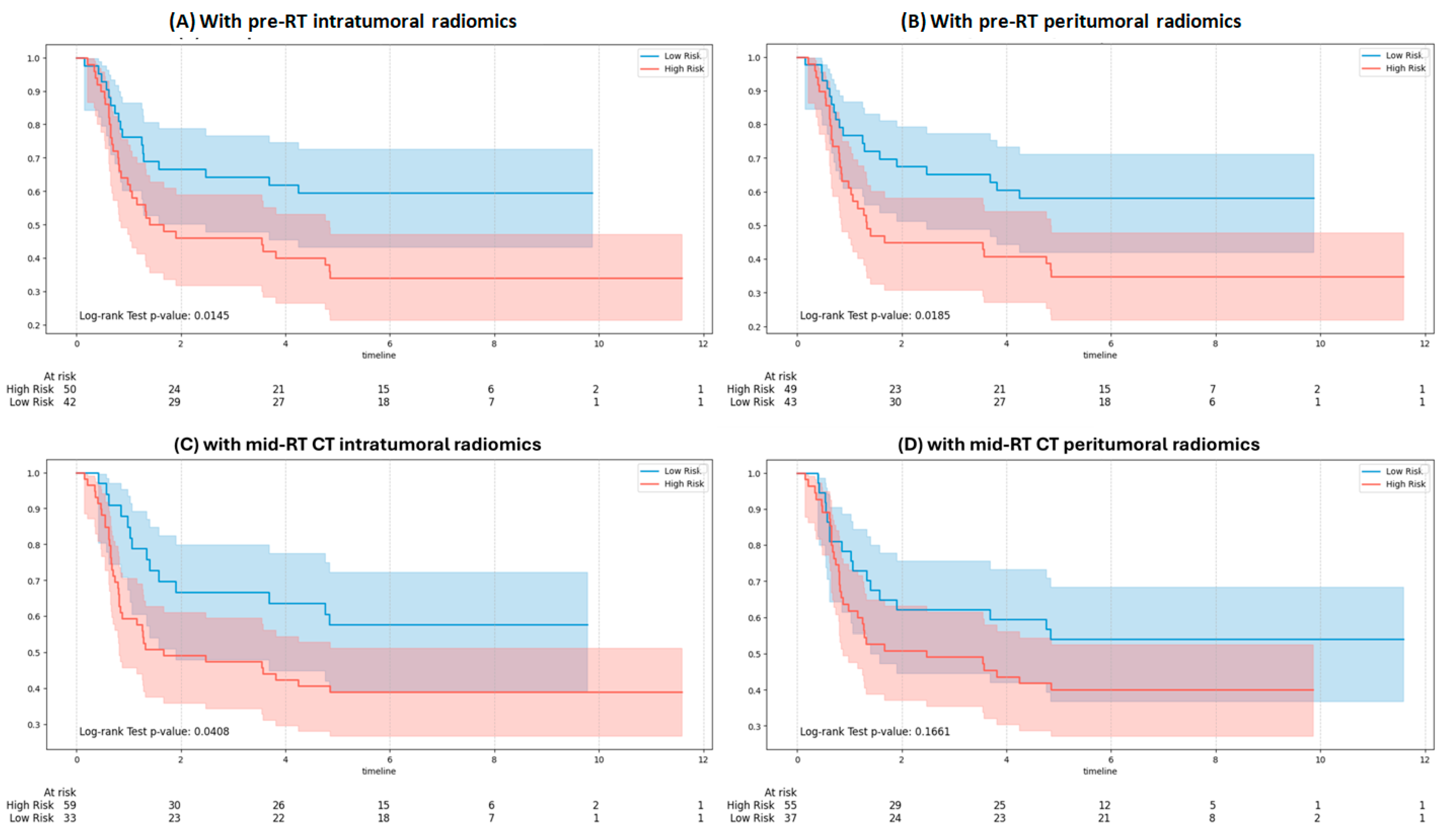 - Combined with pre-RT intratumoral radiomic features to predict the outcome of death(−), recurrence(−), and metastasis(−):
