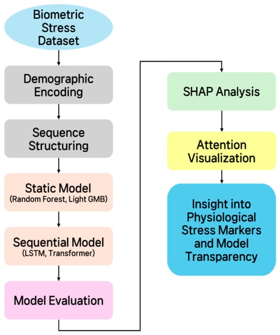 Stress is widely recognized as a factor that significantly impacts human health and social well-being. Chronic or excessive stress can disrupt the body’s homeostatic balance, leading to the onset or exacerbation of various physical and psychological disorders, and is increasingly regarded as a major public health concern [1,2,3]. Accordingly, the ability to detect or predict stress in real time has become an important research focus, with the potential to support timely interventions and personalized stress management strategies that prevent stress-related complications [4,5].