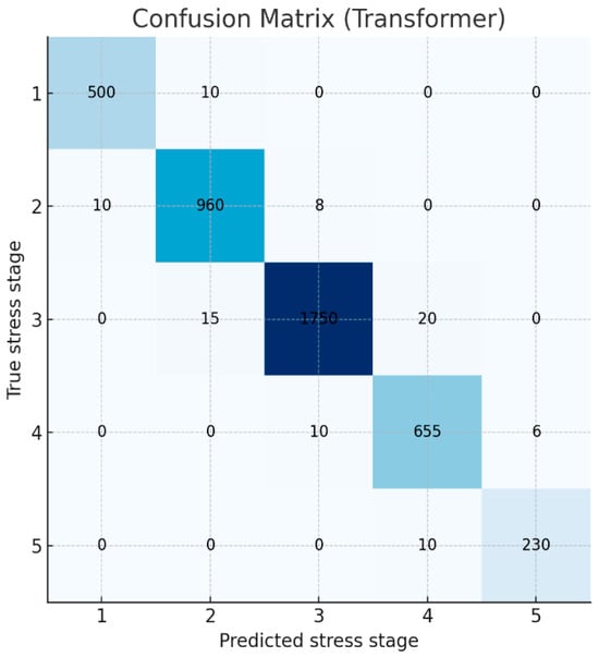 To further examine prediction patterns, the confusion matrix of the best-performing Transformer model is presented in Figure 2. Strong diagonal dominance indicates that the model correctly identified most stress levels (Stages 1–5). In particular, the model demonstrated high precision and recall for the highest stress level (Stage 5), showing that extreme stress states were rarely missed. Some ambiguity was observed among adjacent intermediate stages (Stages 2–4), where true Stage 3 cases were occasionally predicted as Stage 2 or Stage 4, likely due to the gradual and overlapping distribution of physiological stress indicators. Overall, the model exhibited robust classification performance across all stress levels.