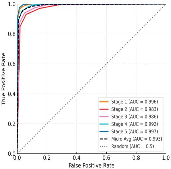 The ROC analysis results once again confirmed the strong discriminatory power of the classification model. All class-specific AUC values were above 0.98 (Stage 1 = 0.996, Stage 2 = 0.983, Stage 3 = 0.986, Stage 4 = 0.992, Stage 5 = 0.997), demonstrating near-perfect classification performance (Figure 3). The micro-average AUC based on the entire sample was also very high at 0.993. Notably, the Transformer recorded fewer false negatives than the LSTM model at the highest stress level (Stage 5). This is interpreted as the self-attention mechanism more effectively capturing long-term physiological changes, such as HRV decline and autonomic imbalance, than the LSTM model.