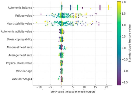 The importance of the top 10 features is sorted by their average SHAP value, and each feature’s point represents its SHAP value. The color of the point indicates the magnitude of the feature value in the corresponding observation, with red dots indicating high feature values and blue dots indicating low feature values. Overall, the model’s predictions were heavily influenced by real-time biometric signals, such as autonomic nervous system indices and heart rate characteristics, while static features such as age and gender had only a very limited impact.