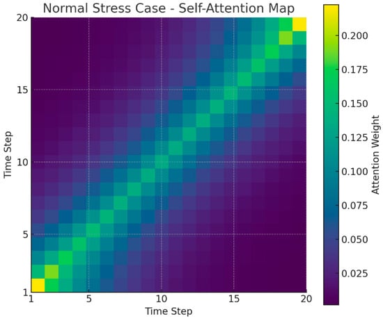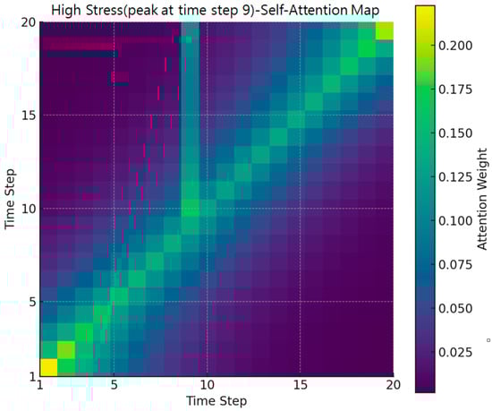 Figure 6 shows a heatmap of self-attention weights for a normal stress case in a single user sequence. This user maintains stress levels 1 and 2 for most timesteps, with no significant spikes. Therefore, no off-diagonal patterns concentrated at specific points in the overall heatmap are observed. The majority of attention values are highly distributed for the user’s own or nearby timesteps in the time sequence, indicating that the model primarily relies on short-term context without significant outliers. Consequently, unlike the high-stress case in Figure 1, Figure 2 exhibits a smooth, uniform, diagonal pattern across the entire time series. This suggests that the Transformer model distributes attention evenly throughout the time series for a user with a stable stress index, without overemphasizing specific timesteps.