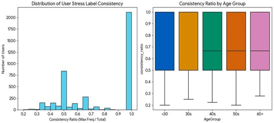 Figure 7 shows a distinct bimodal pattern in the distribution of user-specific label consistency. A large peak is observed at the consistency ratio of 1.0 (i.e., users whose stress level remained unchanged), and the model’s high accuracy for this group drove the overall average performance. Conversely, the long tail, comprising users with frequent label changes, was the primary driver of standard deviation in performance.