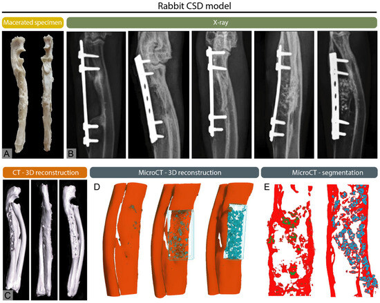 Multimodal imaging of a healed critical-sized segmental defect (CSD) of the rabbit ulna, modified from Stokovic et al. [17] (A) Macerated ulna showing the healed defect region. (B) X-rays of experimental groups illustrating variable degrees of healing, ranging from incomplete bridging to full cortical restoration. (C) CT 3D reconstruction, (D) micro-CT 3D reconstruction, and (E) micro-CT segmentation demonstrating regenerated bone.