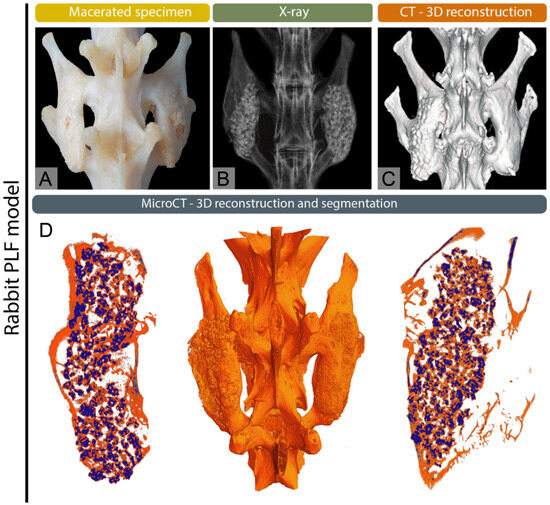 Multimodal imaging of complete postero-lateral spinal fusion (PLF) in the rabbit model, modified from Stokovic et al. [19] (A) Macerated spine, (B) X-ray image, and (C) 3D CT reconstruction showing fusion between adjacent transverse processes. (D) Micro-CT 3D reconstruction and segmentation illustrating osseointegration of newly formed bone with native transverse processes.