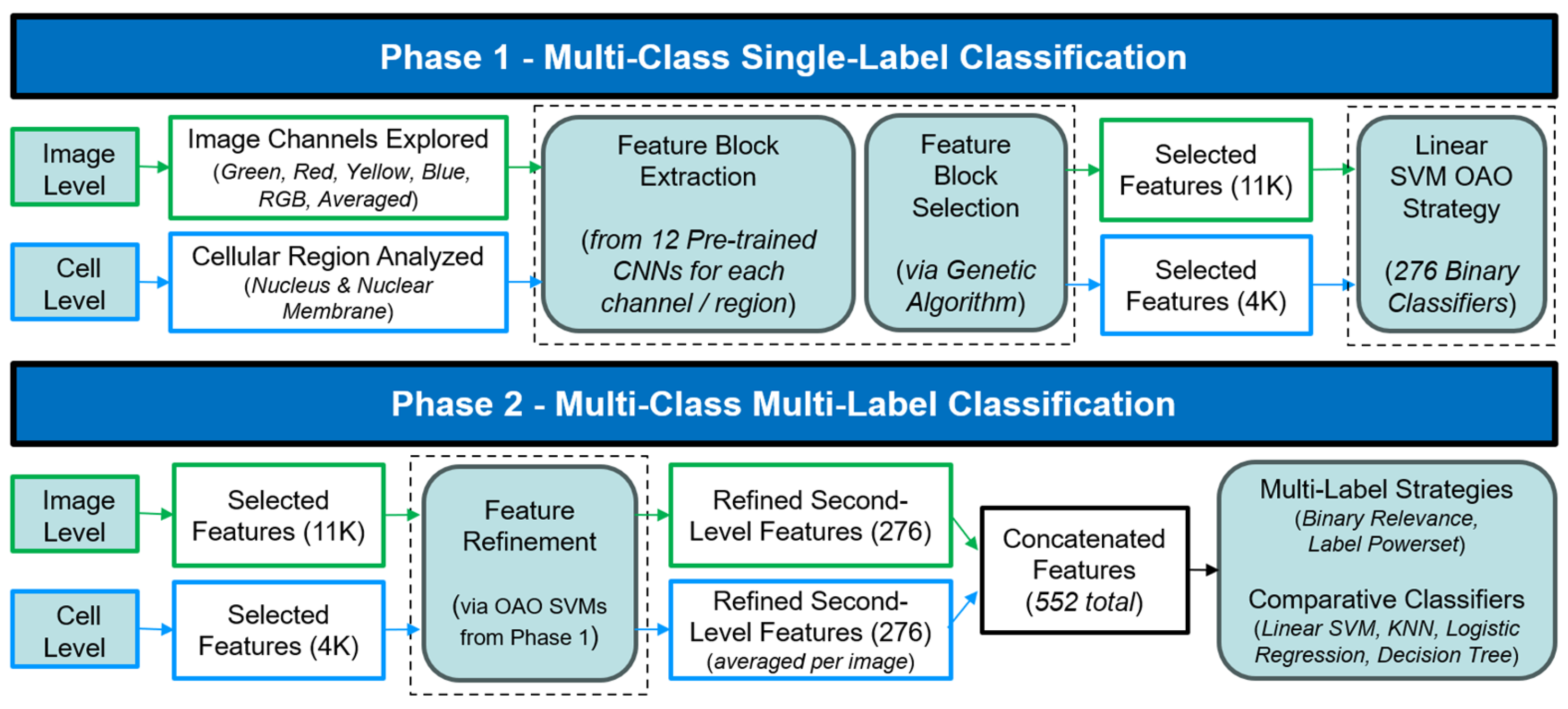 - A dual-level classification framework integrating both image-level and cell-level analysis, introducing two regions of interest at the cellular level (nucleus and nuclear membrane), whose joint use has not been previously investigated in the HPA literature.