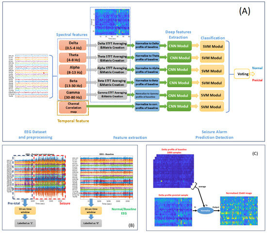 Epilepsy seizures that are not provoked and happen again and again are the characteristics of epilepsy. This can seriously affect the quality of life for affected individuals [1]. Additionally, unpredictable seizures pose a significant danger to patients’ safety while also hindering their involvement in day-to-day activities. In this regard, seizure prediction is critical in managing epilepsy. This would both ensure patient safety and independence as well as promote timely medical intervention to reduce the severity of seizures [2]. Seizure prediction accuracy has been greatly enhanced recently through deep learning and electroencephalogram (EEG) analysis. EEG signals, which record brain electrical activity, provide insights into neural dynamics preceding seizures. By using these signals, researchers seek to recognize patterns that indicate an impending seizure [3,4,5]. Convolutional Neural Networks (CNNs) are being used in seizure prediction and deep learning techniques, which is a new trend in medical research and health care. Seizures are sudden, uncontrolled electrical discharges in the brain that are very difficult for patients and caretakers to handle [6,7,8]. Traditional approaches to predicting seizures rely heavily on the subjective human interpretation of EEG readings; hence, they are time-consuming [9]. However, CNNs present a more promising alternative as they can learn hierarchical features from complex data. In fact, by examining EEG data, CNNs could automatically reveal relevant spatiotemporal patterns associated with seizures [10]. The typical process includes gathering data, cleaning and enhancing signals through pre-processing, representing meaningful patterns using feature extraction, training models using labelled samples (patterns), checking their predictability performance, and deploying it into clinical settings [11,12,13,14]. Finally, this paper aims to demonstrate how CNN-based seizure prediction may lead to better patient outcomes and improved quality of life by enabling early detection and intervention. Further advances in accuracy and reliability depend on the ongoing research and development activities conducted in this field to further enhance these predictive models. The study highlights the key issue of forecasting epileptic seizures so that persons with epilepsy can live a better life. However, due to their random occurrence, it is necessary to come up with dependable prediction techniques. To make early predictions on seizures by analyzing EEG data, our method employs deep learning techniques. After removing noise from the EEG signals and identifying relevant channels, we segmented them into 10 s samples depicting healthy or pre-ictal conditions using the CHB-MIT dataset. We then extracted features from these samples by focusing on frequency bands and inter-channel correlations using Short-Time Fourier Transform (STFT). These features are standardized relative to those found in normal brain activity. Additionally, the efficientnet-B0 model is used for obtaining deep features. Finally, six Support Vector Machine (SVM) models were trained and their outputs were consolidated through a voting mechanism yielding robust predictions of seizures.
