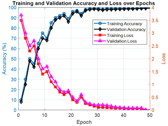 The training and testing were conducted using the Deep Learning Toolbox (MathWorks, Natick, MA, USA). MATLAB was chosen for this study due to its robust suite of built-in tools for signal processing and ease of integration with EEG data formats, which are pivotal for preprocessing and feature extraction in this research. Additionally, the Deep Learning Toolbox provides an efficient environment for rapid prototyping and customization of neural network architectures. While Python is widely used in deep learning, MATLAB’s specialized toolboxes and seamless workflow for EEG analysis offered significant advantages for this specific application.