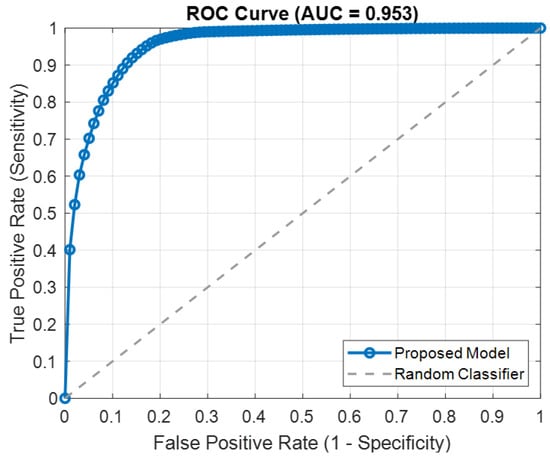 Figure 3 displays the Receiver Operating Characteristic (ROC) curve of the proposed model, showcasing its ability to discriminate between classes (preictal and baseline states). The curve plots the True Positive Rate (Sensitivity) against the False Positive Rate (1-Specificity) for various classification thresholds. The ROC curve exhibits a steep rise near the origin, indicating that the model achieves a high sensitivity while maintaining a low false positive rate for most thresholds. This behavior reflects the model’s strong discriminatory power, which is a critical aspect of seizure prediction. The Area Under the Curve (AUC), a quantitative measure of the model’s overall performance, is close to 1, signifying excellent classification capability. The proximity of the curve to the top-left corner suggests that the model achieves an optimal balance between sensitivity and specificity, minimizing misclassification errors.