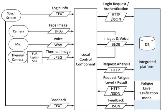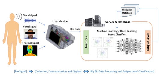 The fatigue level diagnosis system comprises a biometric data collector, an AI-based fatigue classification model, and an integrated platform for system management and monitoring, as shown in Figure 1.