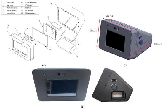 The overall shape of the collector features the display screen positioned centrally, with the microphone, video camera, and thermal imaging camera located adjacent to one another above it. On the right side, there are an Ethernet port, external USB ports, and a battery cover. The dimensions are 300 mm in width, 200 mm in height, and 202 mm in depth, making it suitable for placement on a desk. Figure 3 presents the design and implementation of the collector. Figure 3a illustrates the assembly of the main components, Figure 3b showcases the 3D design, and Figure 3c provides the front and side views of the final product.