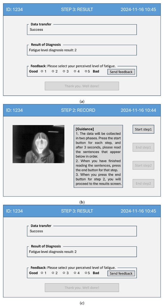Thermal imaging is used instead of color video captured by the optical camera to reduce the user’s psychological burden of seeing their face during data collection, thereby enabling more accurate fatigue diagnosis. Once data collection is complete, the third screen displays the fatigue level diagnosis results. As shown in Figure 4c, this screen presents the data transmission status and the fatigue diagnosis results. It also allows the user to send their feedback to the integrated platform.
