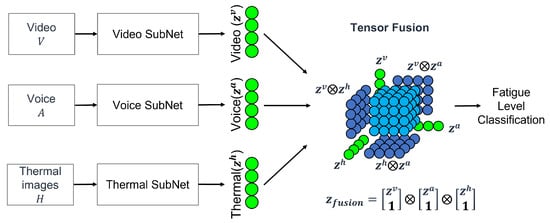 The integrated model employs a method based on multi-modality tensor fusion, as illustrated in Figure 5 []. This approach combines the features extracted by each SubNet from the input data to classify the fatigue level.