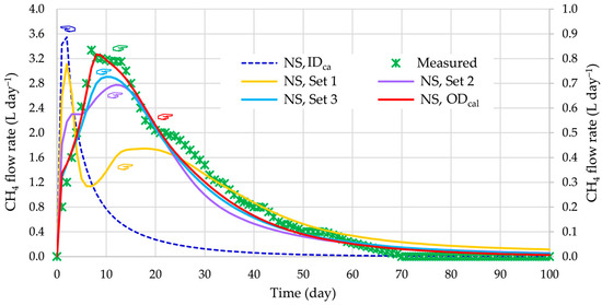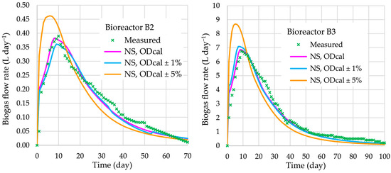 In order to test the importance of the accuracy of calibration of all model parameters, an extra study was performed to include various perturbations of the calibrated values; the observed bioreactors are B2 and B3. For this purpose, the impact of random perturbations of all BioModel parameters on the AD performance was investigated. In the case of small perturbations, the values of model parameters were randomly generated based on a perturbation of their calibrated values (ODcal ). In the case of high perturbation, the values of model parameters were randomly generated based on a perturbation of their calibrated values (ODcal ). The comparison of the simulated AD performances with the measured data are shown in Figure 5. The values of average differences in biogas flow rates in the case of validation in bioreactor B2 increases by increasing the perturbation of calibrated values of model parameters from 11.5% (ODcal) and 12.0% (ODcal ) to 29.1% (ODcal ). In the case of validation in bioreactor B3, the obtained average difference of the biogas flow rate increases from 11.2% (ODcal) and 14.6% (ODcal ) to 34.5% (ODcal ). It is evident that using 5% random perturbation of calibrated values of model parameters, the discrepancy between simulated and experimental AD performance can increase up to threefold with respect to those obtained with ODcal.