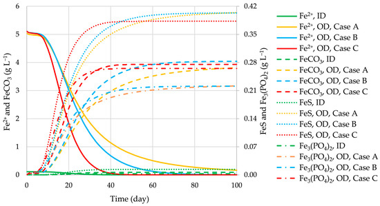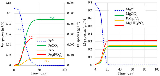 The upgraded BioModel enables predictions of the concentration of TEs during the AD process. As an example, the concentrations of various Fe and Mg species at ODcal are presented in Figure 3.