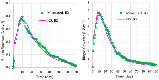 The validation of BioModel parameters, which were calibrated with respect to the experimental data of the AD process in bioreactor B1, is performed for the AD processes in bioreactors B2 and B3. For these two cases, the numerically obtained biogas flow rates are compared with measured data, as shown in Figure 4. The average differences in biogas flow rates are 11.5% (bioreactor B2) and 11.2% (bioreactor B3). In both cases, the biogas flow rate obtained using NS agree very well with the experimentally obtained one. This good agreement of AD performance confirms also the efficiency of the ASO procedure for calibration.