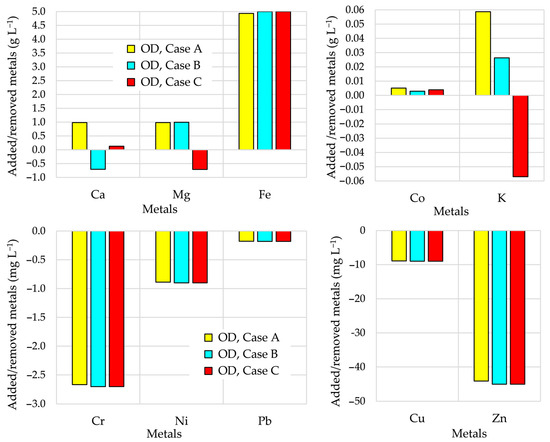 Some results of AD process optimization are shown in Figure 6, Figure 7, Figure 8 and Figure 9. The optimized amounts of added/removed TMs in the optimization Cases A, B, and C with respect to the initial TM concentrations in the feeding substrate are shown in Figure 6. It is evident that in all cases, the heavy metals Cr, Ni, Pb, Cu, and Zn have to be removed from the feeding substrate before starting the AD process, while Fe and Co should be added. The light TMs should be added or removed independently of the optimization case. All light TMs should be added in all cases, with the exceptions of removing Ca in Case B as well as Mg and K in Case C.