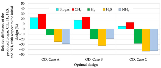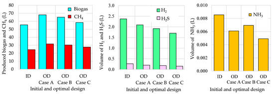 Using these optimized concentrations of TMs in the feeding substrate, the quality and quantity of the produced biogas are improved in all cases, as shown in Figure 7. The obtained results show that the highest biogas production is reached in Case A, where the objective of optimization is related only to the maximization of biogas volume. As expected, by including other requirements in the objective and constraint functions (Cases B and C), the improvement in biogas production becomes smaller. By comparing the obtained optimal designs with the initial design in Figure 8, the biogas production increases by 22.6%, 17.3%, and 5.4% in Cases A, B, and C, respectively. The CH4 production with respect to the initial design increases by 29.4%, 23.6%, and 13.2% in Cases A, B, and C, respectively.