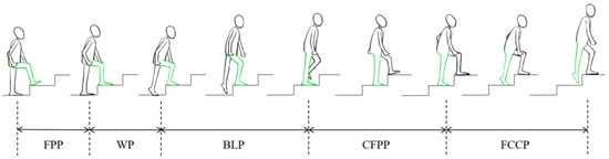 A complete gait cycle scheme during stair climbing, consisting of a support phase, including a Weight-bearing Phase (WP), a Body Lifting Phase (BLP), and a Continuous Forward Propulsion Phase (CFPP); and a swing phase, including a Foot Contour Clearance Phase (FCCP) and a Foot Placement Phase (FPP) [37]. The FPP could not be measured in the motion cycle of this study for the contiguity of stair-climbing motion.