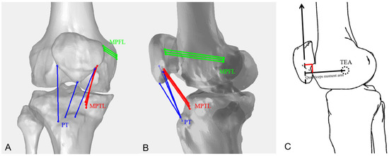 Using MR images of each knee, the footprints of the PT, MPTL, MPFL, and QMA were digitized on the sagittal MR images. The insertion areas of the PT, MPTL, and MPFL were evenly divided into three equal portions to create three equal fiber bundles: the PTs were divided into the medial, central, and lateral bundles, whereas both the MPFL and the MPTL were divided into the proximal, central, and distal bundles. The length of each bundle was measured as the distance between the centroids of the bony insertions of the bundles from the series of matched knee models. Because the MPFL wraps around the medial femoral condyle, the line connecting the bundle centroids on the femur and patella was projected on the bony surfaces to create three curved lines (Figure 2A,B). The lengths of these projected curves were measured as the ligament bundle length. The direction of the quadriceps force was defined as the line connecting the footprints of the quadriceps muscles on the femur and patella, with the length of the QMA nearly equal to the shortest (perpendicular) distance from the knee rotation center to this connecting line at all flexion angles (Figure 2C).