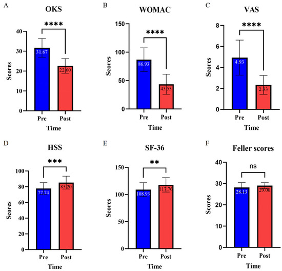A function scoring system including OKS (A), WOMAC (B), VAS (C), HSS (D), SF-36 (E), and Feller scores (F) was used to compare the patient outcomes before and after OWHTO. The label ns means p value > 0.05, ** means p value < 0.01, *** means p value < 0.001, and **** means p value < 0.0001.